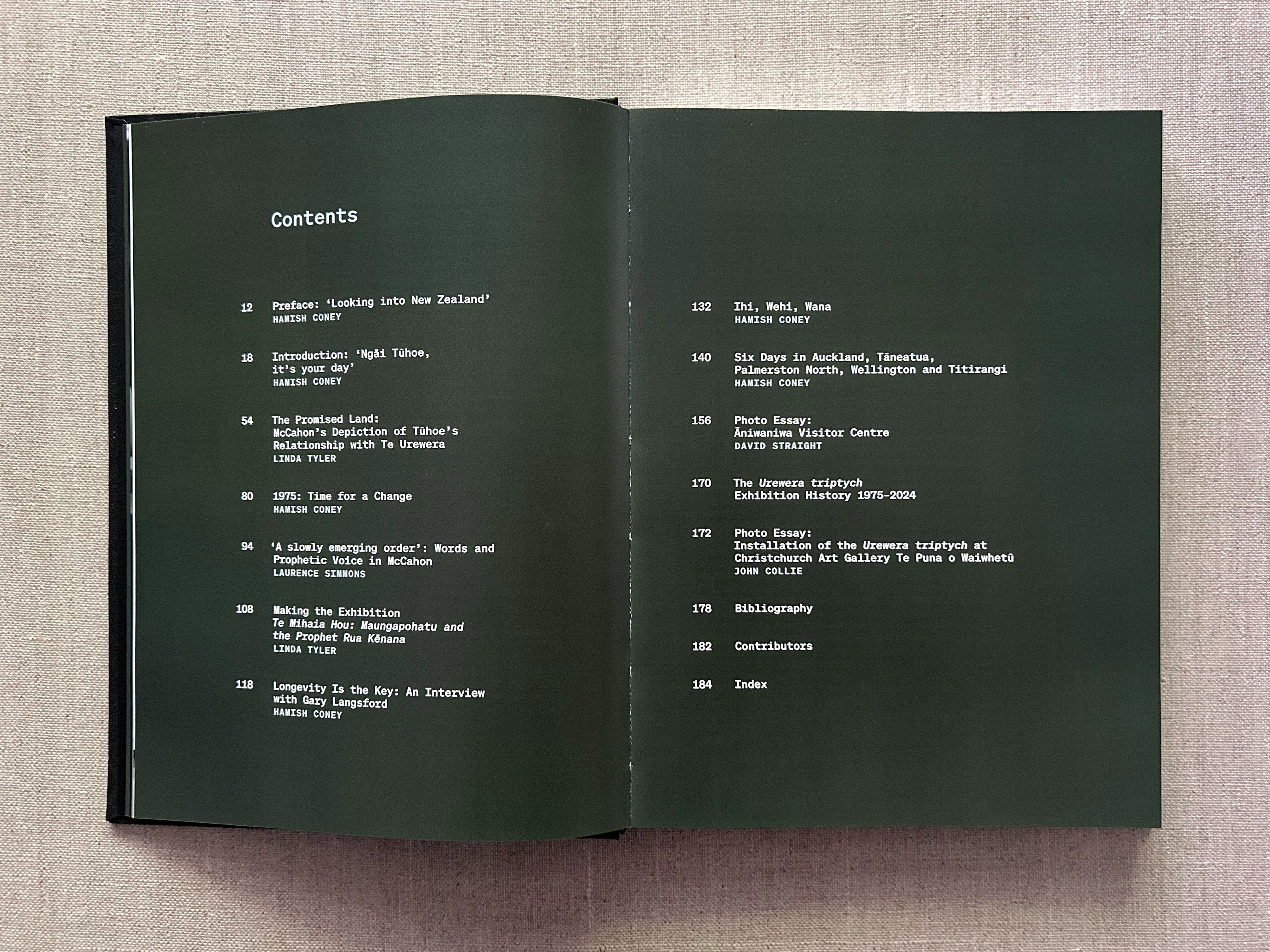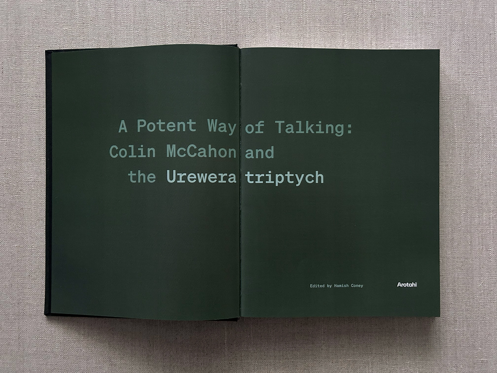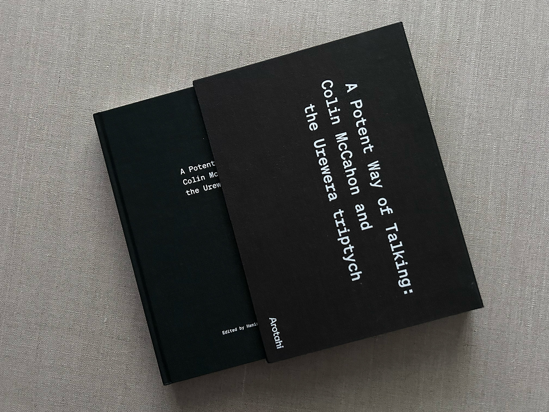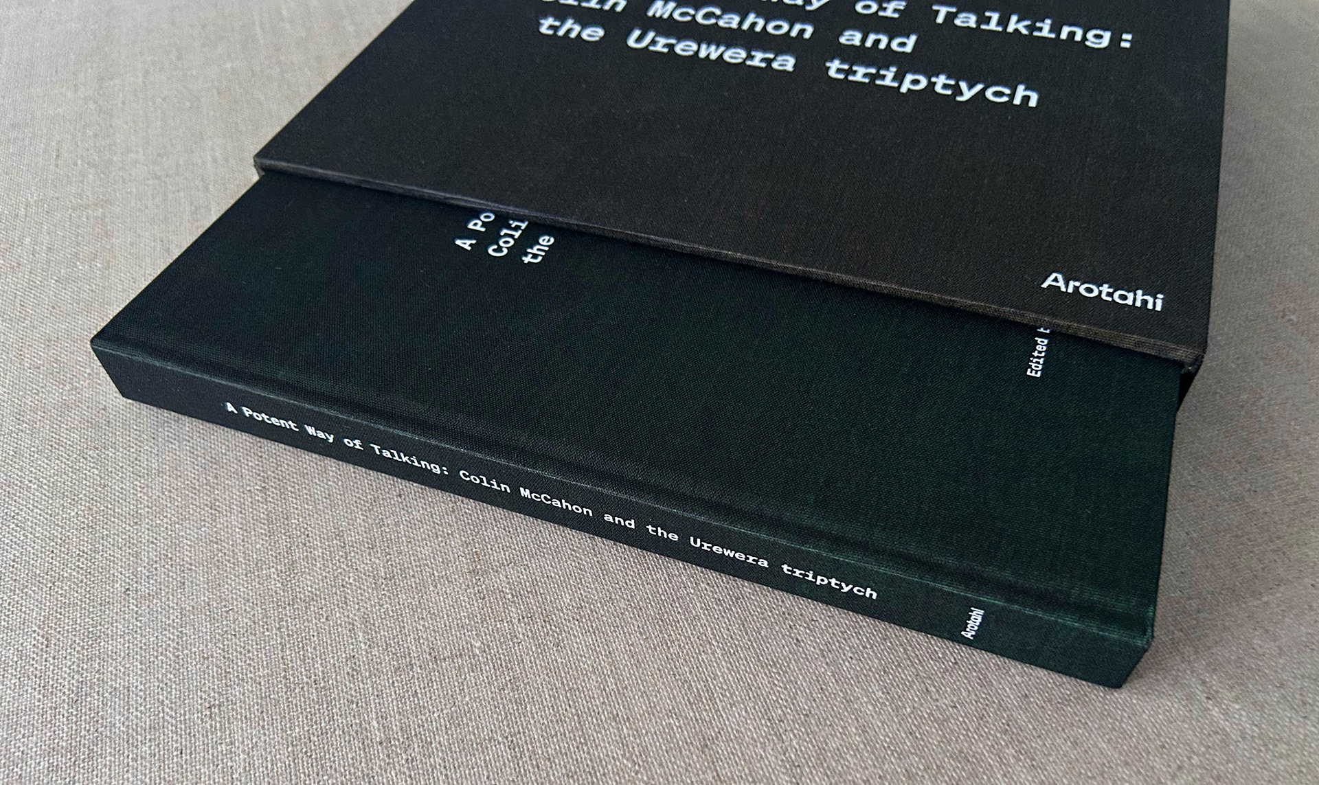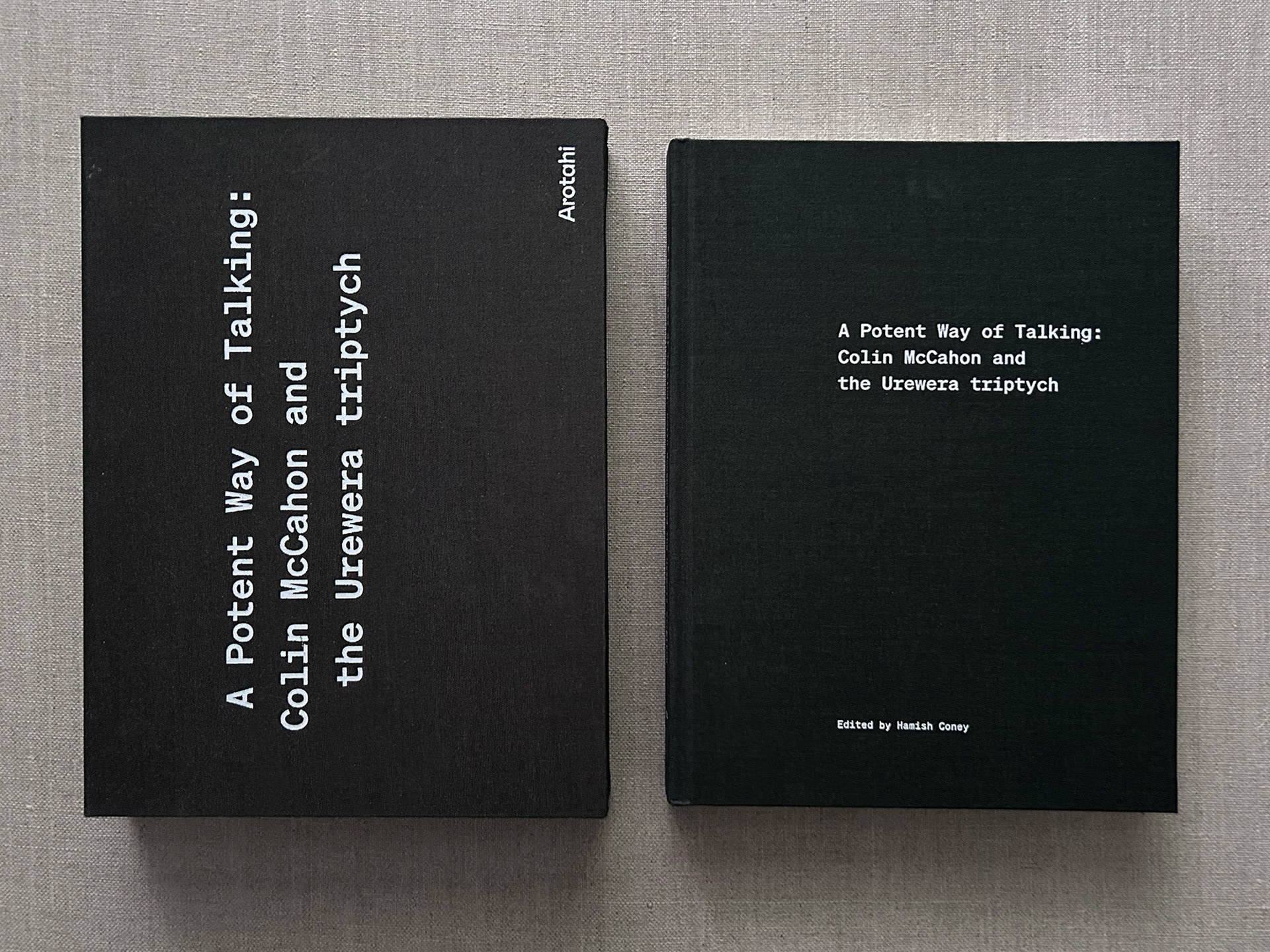 Publication design for Arotahi Gallery Auckland. Edited by Hamish Coney. 192pp case bound with slip case utilising two cloth colours and white foil blocking.